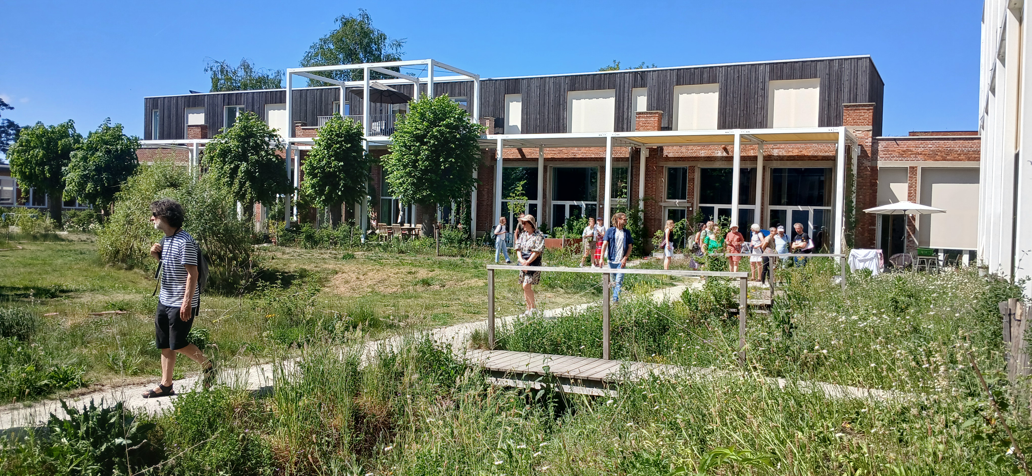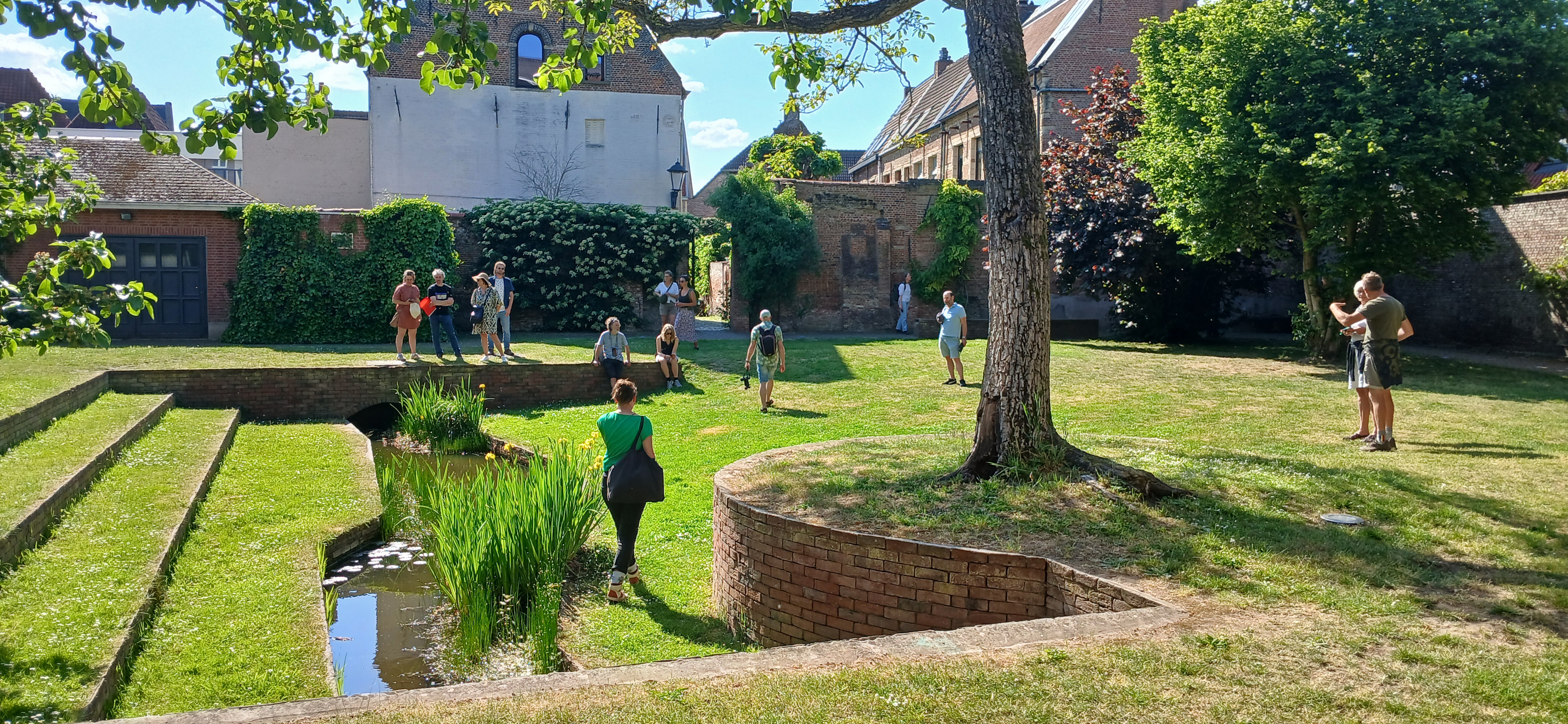 Op zondag 11 mei bezochten we in Mechelen enkele inspirerende collectieve tuinen en binnengebieden die een nieuw publiek leven kregen. We ontdekten zowel historische stadstuinen als recent getransformeerde binnengebieden net buiten de vesten, waar ontharding, biodiversiteit, waterbeheer en zachte recreatie centraal staan. Een mooi voorbeeld was Gummarushof, waar 24 gezinnen samen met vzw Gummarus OLV hun terrein omvormden tot een groene, open oase met aandacht voor infiltratie van hemelwater, hergebruik van materialen en buurtgerichte activiteiten. Tijdens de excursie kregen we inzicht in hoe landschapsarchitecten omgaan met de balans tussen natuur, privacy en sociale interactie, en hoe collectieve tuinen functioneel én aantrekkelijk kunnen worden ontworpen.